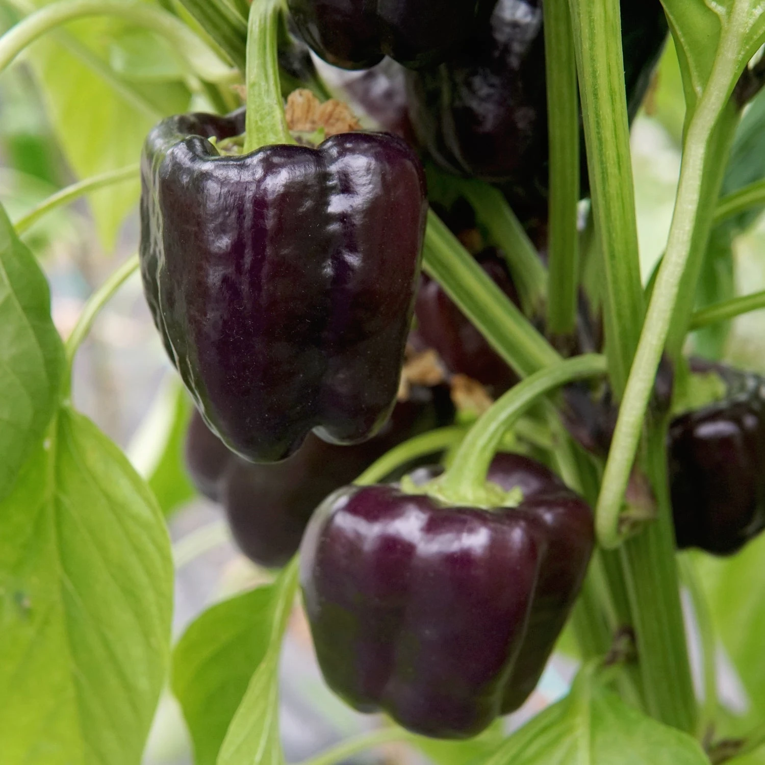 55 days. Dragonfly’s striking, deep purple, nearly black shade is guaranteed to impress! These elongated, 3 inch fruit emerge light green and quickly develop their dark pigment with thick walls and a pleasantly sweet flavor. Productive plants perform well even in growing conditions with lower fertility. Fruit maintains its purple hue for an extended period but will eventually ripen to red. HR: TMV, ToMV 0–2.