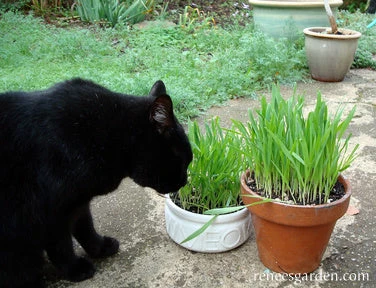 Fill a 6 inch diameter or larger pot with moistened planting mix. Sprinkle seeds 1/4 inch apart over the surface, cover 1/2 inch deep with mix, and water gently. Keep pot moist but not soggy, and be sure to provide a good light source. The pot of grasses can be kept indoors for pets to graze on at their leisure. Fertilize every 2 weeks using a non-chemical fertilizer, such as fish emulsion.