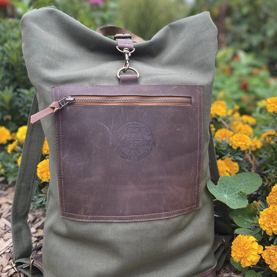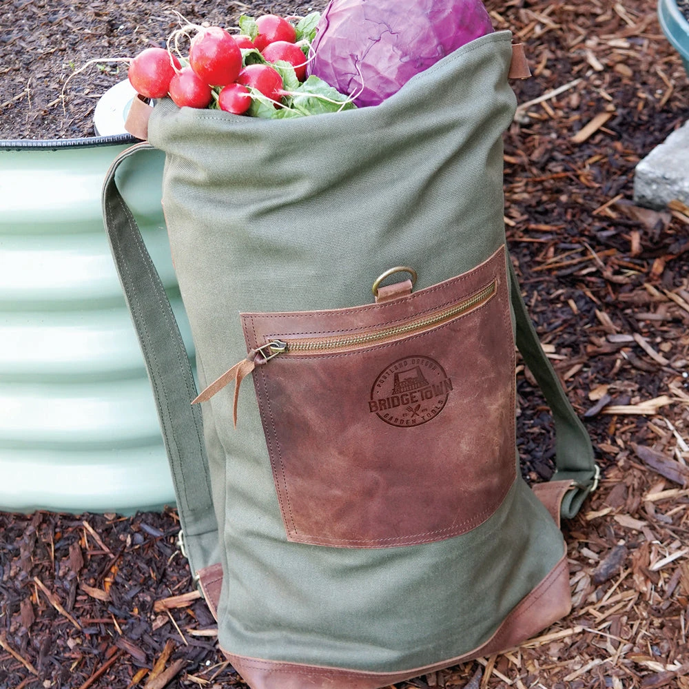 Our new, durable, waxed canvas bag has more uses than we can list. This will be your go-to bag to gather produce from the garden, carry tools around the yard, pack groceries from the farmers market and much more. At 22 inches long, 12 inches wide and 6 inches deep, there’s plenty of room for everything you haul wherever you roam. The forest green canvas coordinates with any outfit, and shoulder straps reinforced with leather keeps it securely on your back. Detailed with a twill liner, zippered leather pocket for valuables and a clip to lock in the contents of the bag.