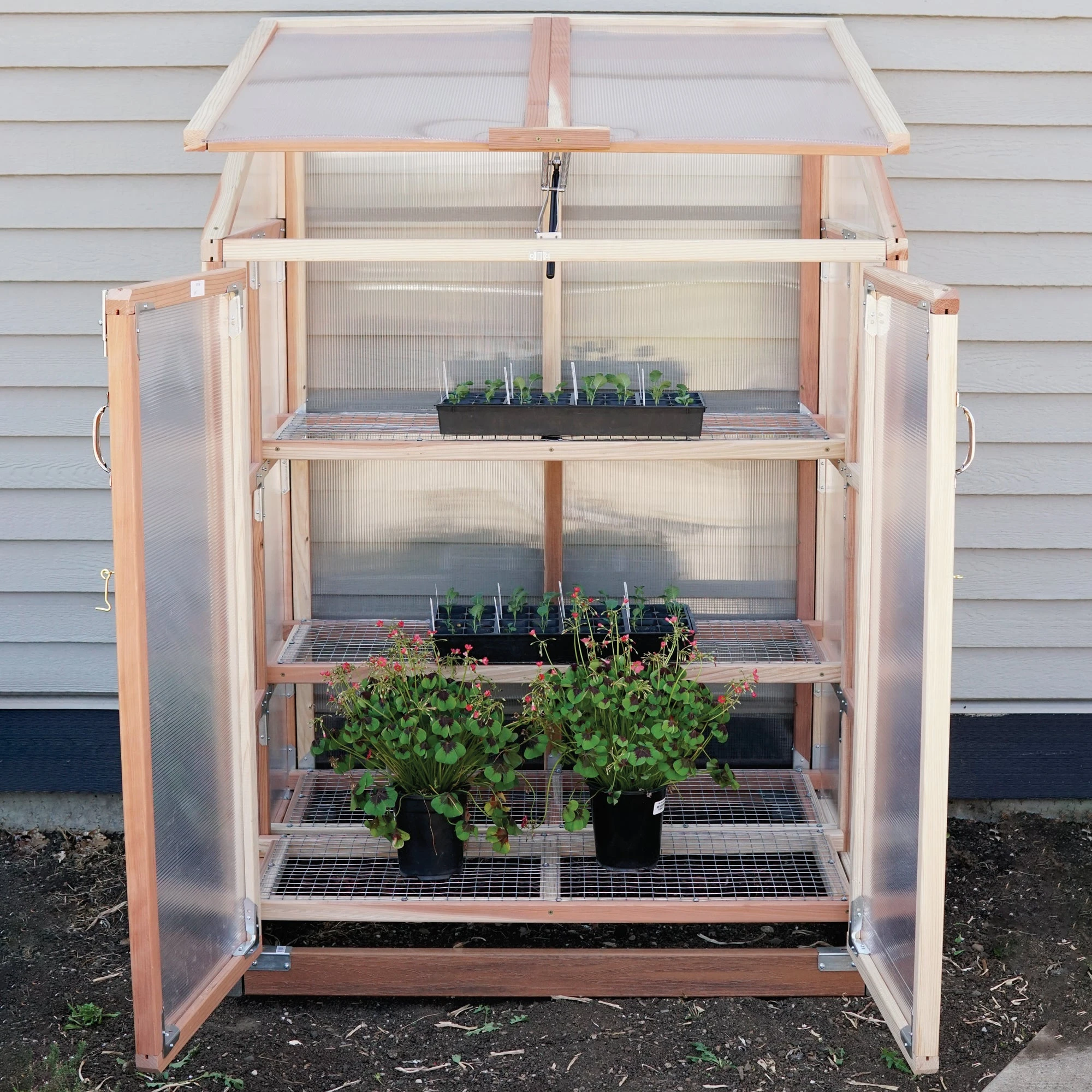 We’ve looked at a lot of cold frames, and the Patio Gardenhouse is by far the best. This roomy, rugged structure will weather many seasons for seed starting, season extending and overwintering more tender plants. Build of the best quality materials: solid redwood frame, double-wall polycarbonate, durable, and composite decking for the sill plate. Every corner is reinforced for strength and stability. Four, heavy-duty adjustable shelves offer plenty of room for flats, potted plants and even larger specimens. Comes complete with an automatic vent opener to allow the structure increased air circulation, beginning to open the lid when the temperature reaches approximately 65°F and fully open around 85°F. All hardware and complete instructions included, the Patio Gardenhouse is shipped partially assembled in 2 boxes directly from the manufacturer. Requires some simple tools for final assembly. Extra roomy structure measures 4 feet wide, 3 feet deep, and 5 feet 8 inches tall at the back.