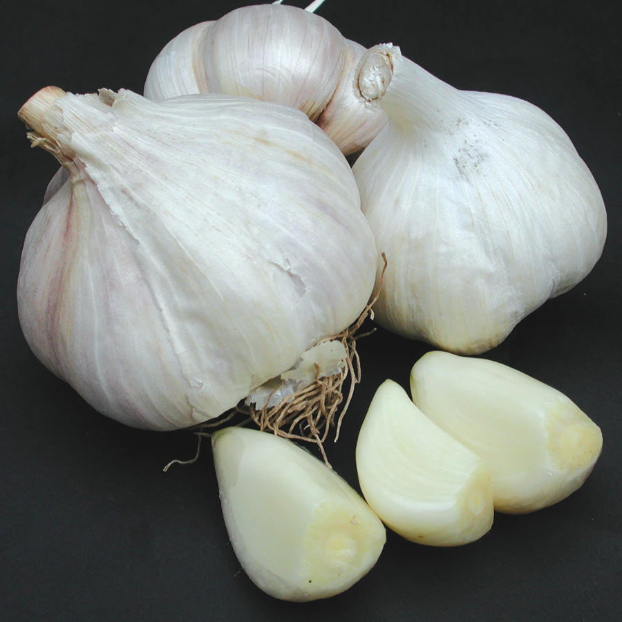Late-season, Porcelain type. Finally, good strong garlic in a large clove! The heritage of this unique garlic can be directly traced to northern Germany. It could possibly be the most cold-hardy variety known, having been documented to –18°F in Eastern Oregon. And one grower, who cultivated this variety in New York for more than 10 years, claims it withstood –60°F. Let us know how it does for you! It’s a potent hardneck that is easy to peel. Its large clove size makes it a great all-purpose garlic, especially good for baking.