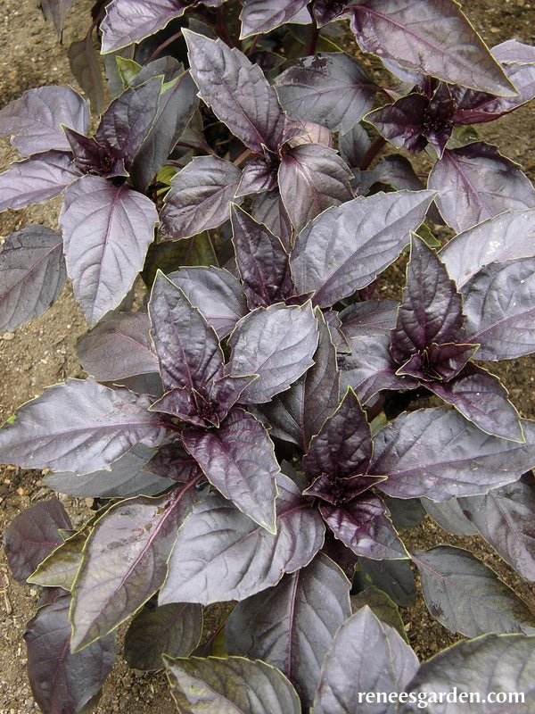 Excellent heirloom strain with beautiful garnet-purple leaves and pink flowers. Equally at home in vegetable, herb or ornamental flower beds and borders. A fragrant and striking addition for bouquets.