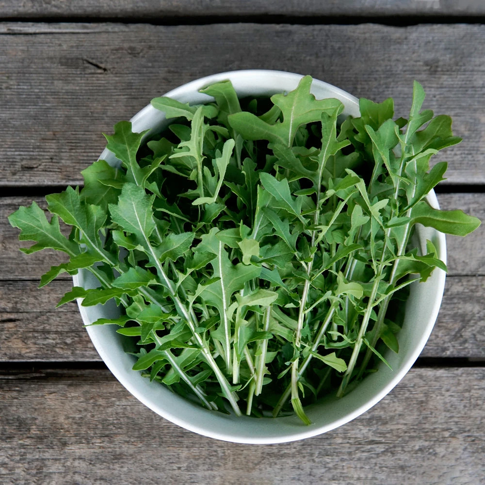 Eruca vesicaria 30 days. Speedy’s serrated, bright green leaves have the shape of wild arugula, but the mild peppery pungency of salad arugula. It’s also the fastest of its type to mature and is especially recommended for late autumn, winter, and early spring cultivation. Approximately 400 seeds per gram.