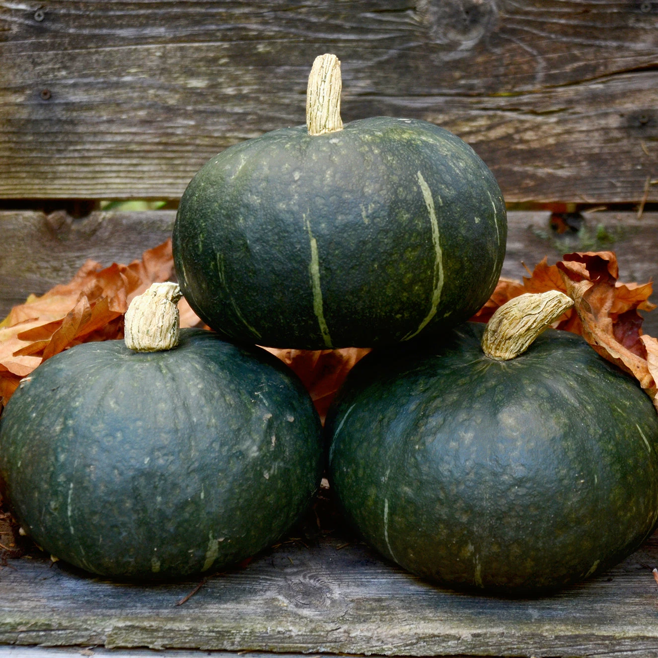 Cucurbita maxima 100 days. We’ve been looking for a superior kabocha for years and are happy to have landed on Sweet Mama. It’s a unique kabocha that produces on a very space-saving short vine. In our trials Sweet Mama was also among the earliest to mature. The dark green fruit reach about 8 inches across and 4 inches tall with striking gray ribs and speckles. Inside, the meaty flesh is a dark yellow with a nutty flavor.