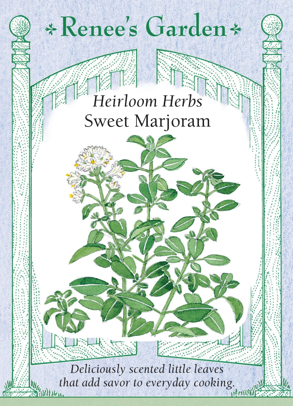 This perfumed Mediterranean herb is at its best when harvested fresh from the garden, with a complex, sweeter pungency than its more assertive cousin, oregano. Marjoram is easy to grow from seed and forms an attractive mound of small-leaved green sprigs. This versatile kitchen companion combines well with garlic, onions, thyme, basil, and bay leaves. It is the herb of choice for flavoring cheese and egg dishes, herb breads and stuffings, mushrooms, poultry or beans and adds bright flavor to a wide range of everyday cooking.