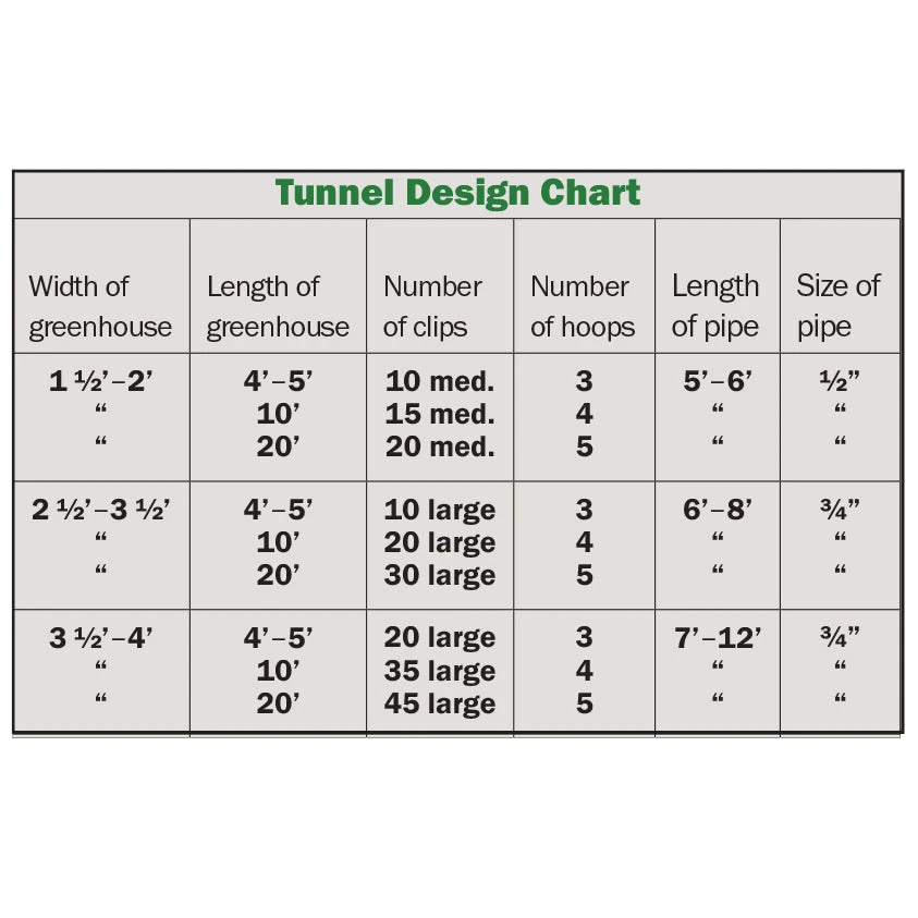 Hoops: Use ½ or ¾ inch poly pipe cut to 5–12 foot lengths. Slip longer lengths over ½ inch rebar stakes driven into the ground. Complete instructions included.