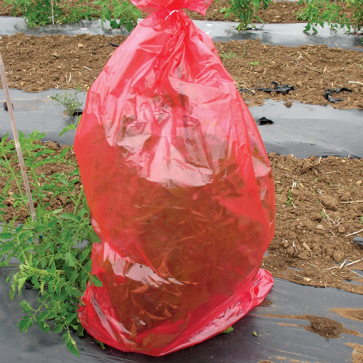 Designed to fit over standard tomato cages, they are roomy enough for the most aggressive growers. Constructed as 1 long sleeve, simply cut to the length you want, twist-tie the top (twist ties are included), and slip over the plant. The red, perforated plastic allows air circulation while protecting the plants from cold, rain, pests, and also hastens the ripening of fruit. The color may fade, but the storable sleeves offer seasons of use. Enough for 6-7 plants: 28 inches by 20 feet.