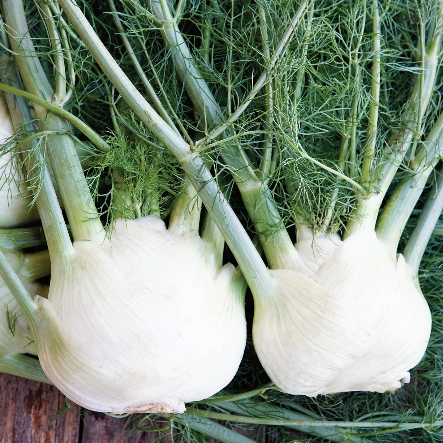 Foeniculum vulgare 75 days fall harvested. This short-day overwintering type of fennel is delicious braised, grilled, in au gratin, or raw in salads. The fresh anise flavor moderates somewhat when cooked. The large, round, white bulbs elongate slightly in northern areas. Bred for winter and spring harvest. Try a simple salad of thinly sliced fennel dressed with olive oil, sea salt, fresh ground pepper, and a dash of lemon juice. Top with shaved Asiago cheese curls. Approximately 40 seeds per ¼ gram.
