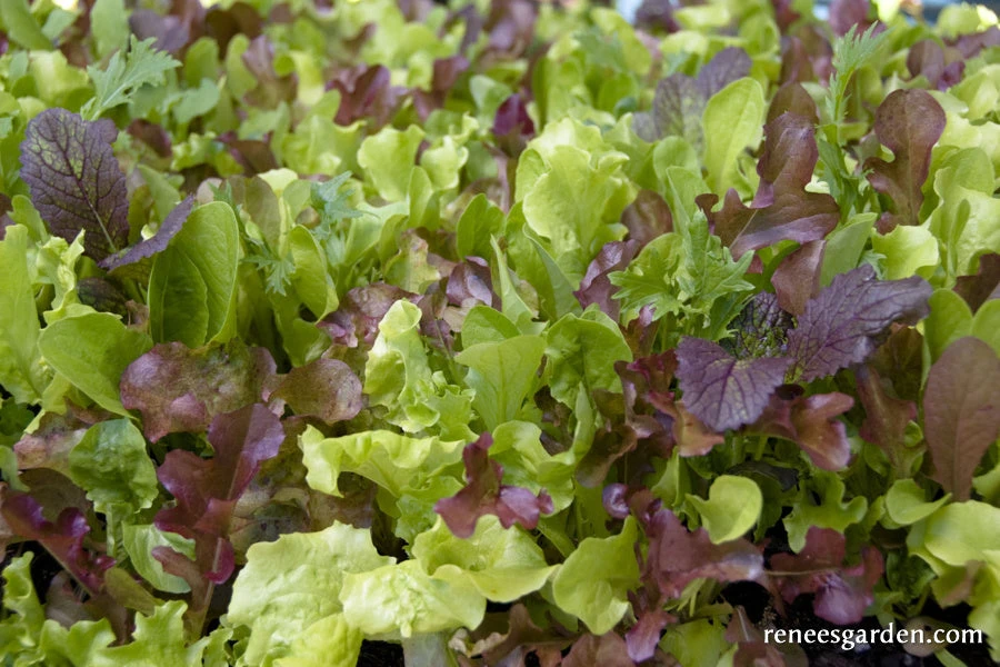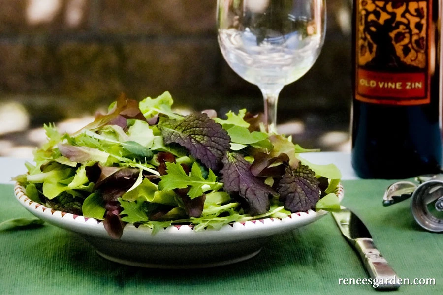 To harvest by the “cut and come again” method, wait until plants are 4 or 5 inches tall. Cut as much as you need, using scissors to shear off a patch of leaves 1 to 2 inches above the soil level. Water well and fertilize lightly and plants will regrow for several more cuttings. Dress with a simple vinaigrette to set off the wonderful colors, diverse fresh flavors and delicate textures of this delicious salad mix.