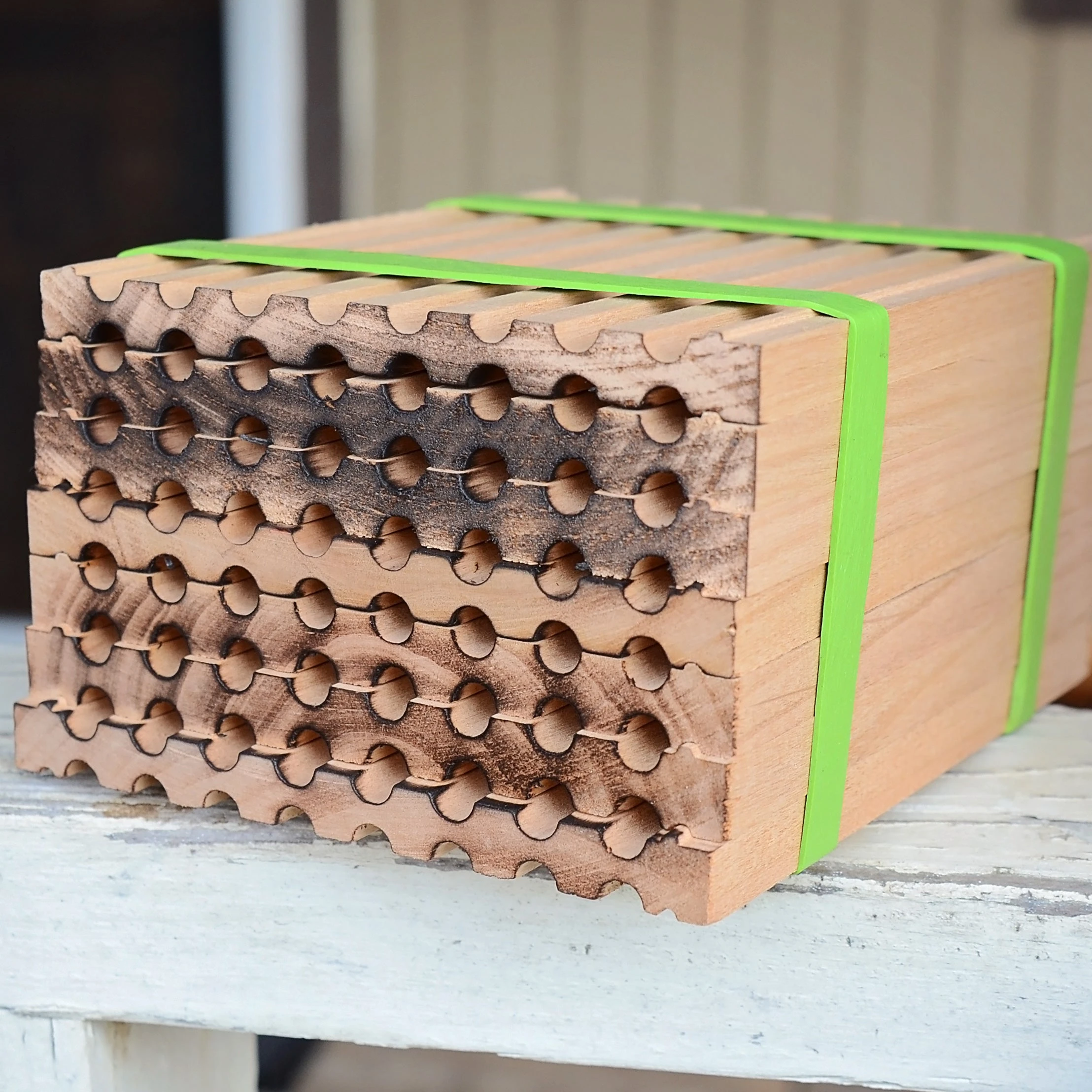 Our Wood Nesting Trays are 2-piece tunnel systems. Precision-machined of solid Northwest alder, these trays are designed to provide holes with the correct diameter and depth that female mason bees require to lay their eggs. The 2-part tunnel design makes harvesting the cocoons and cleaning simple no need for tube liners. The tray system features a side-locking design to seal out predators, and when assembled, the color and slightly uneven texture of the block face aids the bees in identifying their tunnels. Contains 7 trays with 48 holes and includes 2 heavy-duty rubber bands to ensure stability. Dimensions are 5 1/2 inches x 3 1/2 inches x 6 1/4 inches.